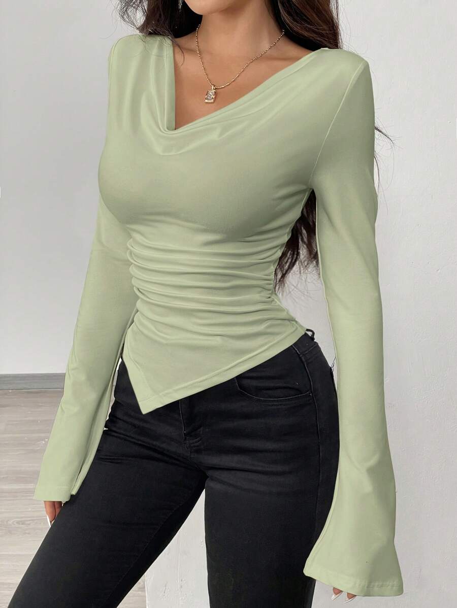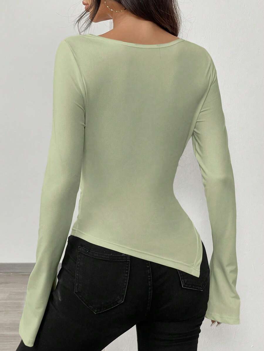 Upgrade your everyday style with the Casual Asymmetric Knit T-Shirt, a modern twist on a classic wardrobe staple. Crafted from soft, stretchable knit fabric, this T-shirt offers a perfect balance of comfort and style. The asymmetric hemline adds a unique, contemporary edge, making it stand out from the ordinary. Designed for effortless wear, it pairs beautifully with jeans, shorts, or skirts for a chic, laid-back look. Perfect for casual outings, weekend wear, or relaxed office days, this top brings a touch of understated sophistication to your everyday wardrobe.