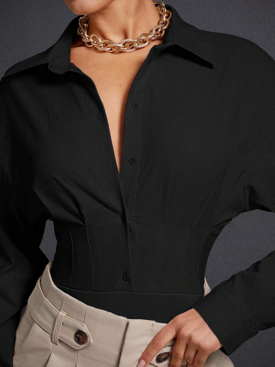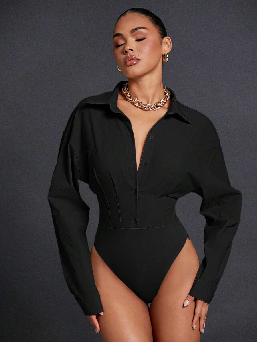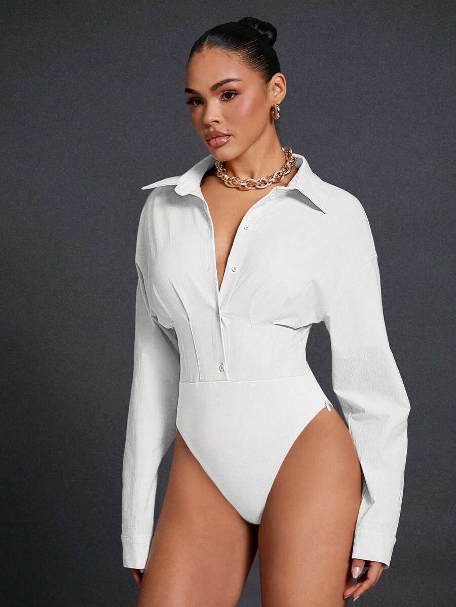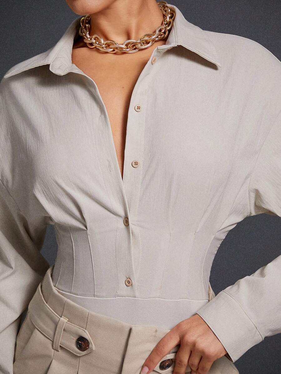 Redefine everyday elegance with the Stylish Long Sleeve Shirt Bodysuit, a perfect blend of sophistication, comfort, and versatility. Designed to deliver a polished, tucked-in look that stays flawless all day, this bodysuit combines the refined style of a classic shirt with the functionality of a fitted bodysuit. Crafted from soft, stretchable fabric, it offers a sleek fit that flatters every figure while ensuring all-day comfort. Perfect for the office, casual outings, or evening events, it pairs effortlessly with skirts, trousers, or jeans for a chic, put-together look.