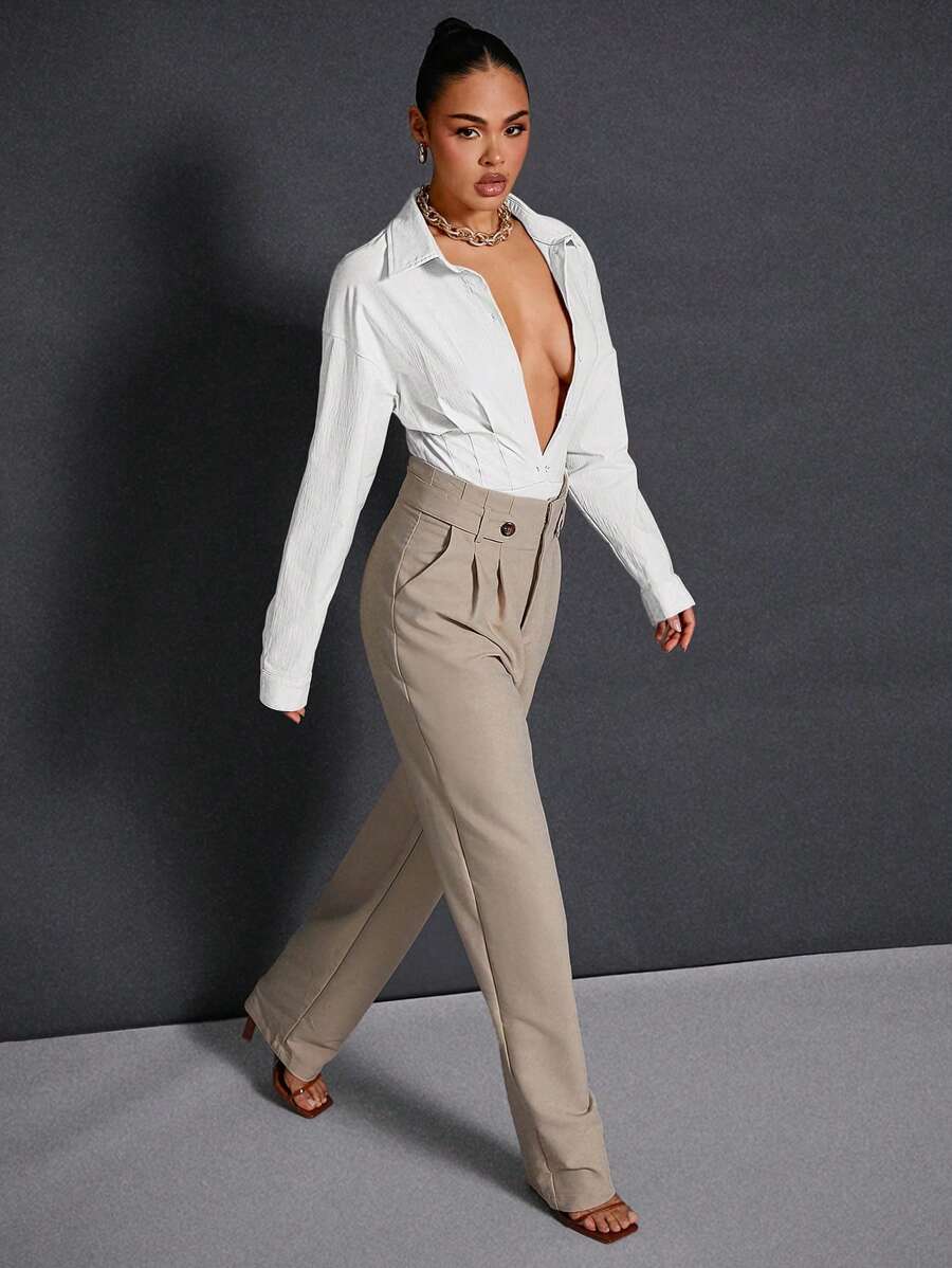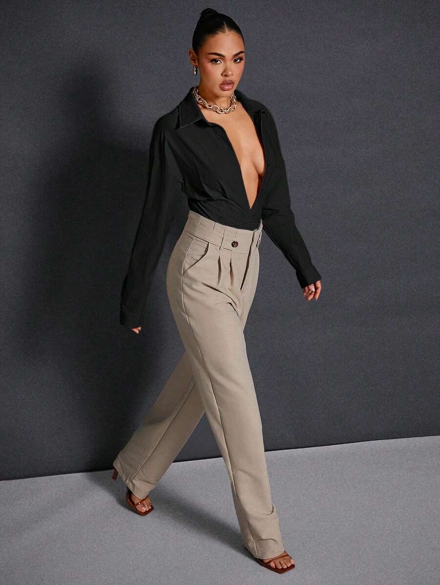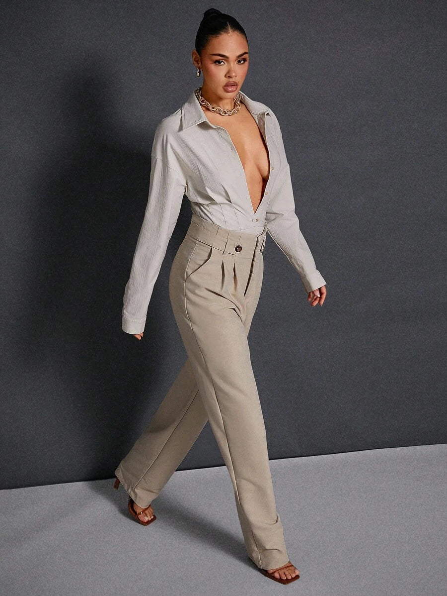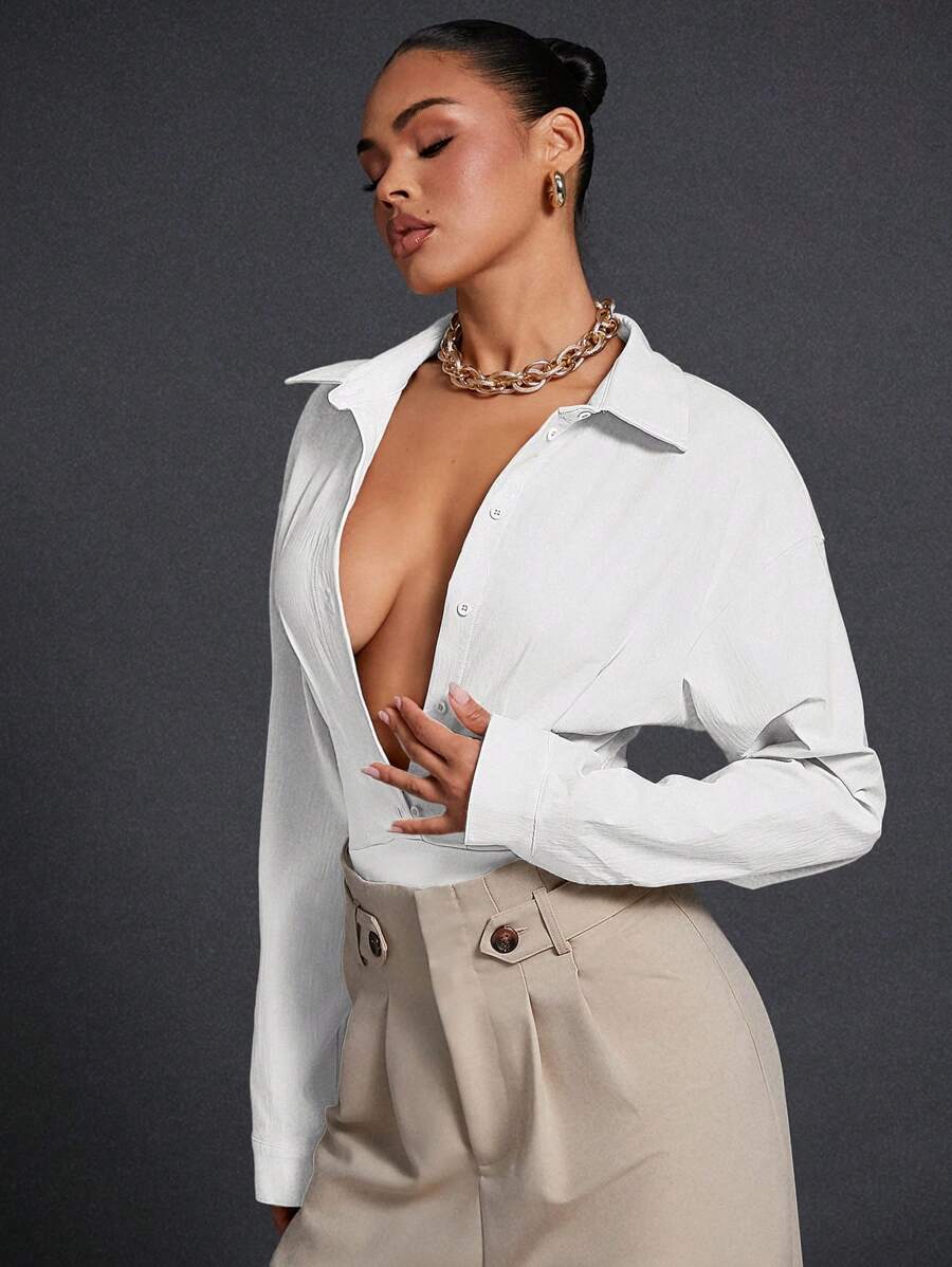 Redefine everyday elegance with the Stylish Long Sleeve Shirt Bodysuit, a perfect blend of sophistication, comfort, and versatility. Designed to deliver a polished, tucked-in look that stays flawless all day, this bodysuit combines the refined style of a classic shirt with the functionality of a fitted bodysuit. Crafted from soft, stretchable fabric, it offers a sleek fit that flatters every figure while ensuring all-day comfort. Perfect for the office, casual outings, or evening events, it pairs effortlessly with skirts, trousers, or jeans for a chic, put-together look.